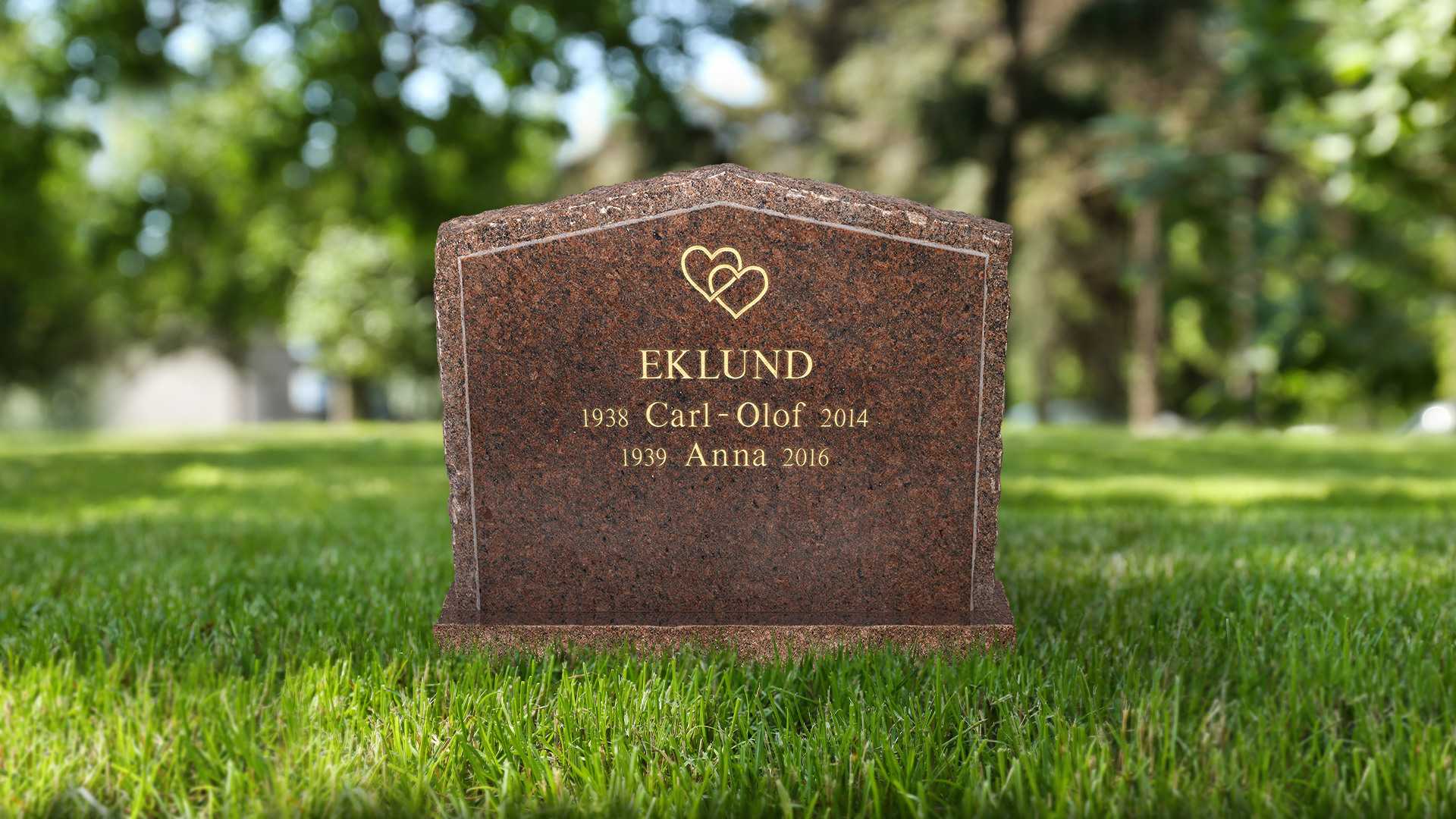 Stående sten med symmetriskt vinklad topp på ovansidan och råhugget kantslag.- Modell: Stående bred