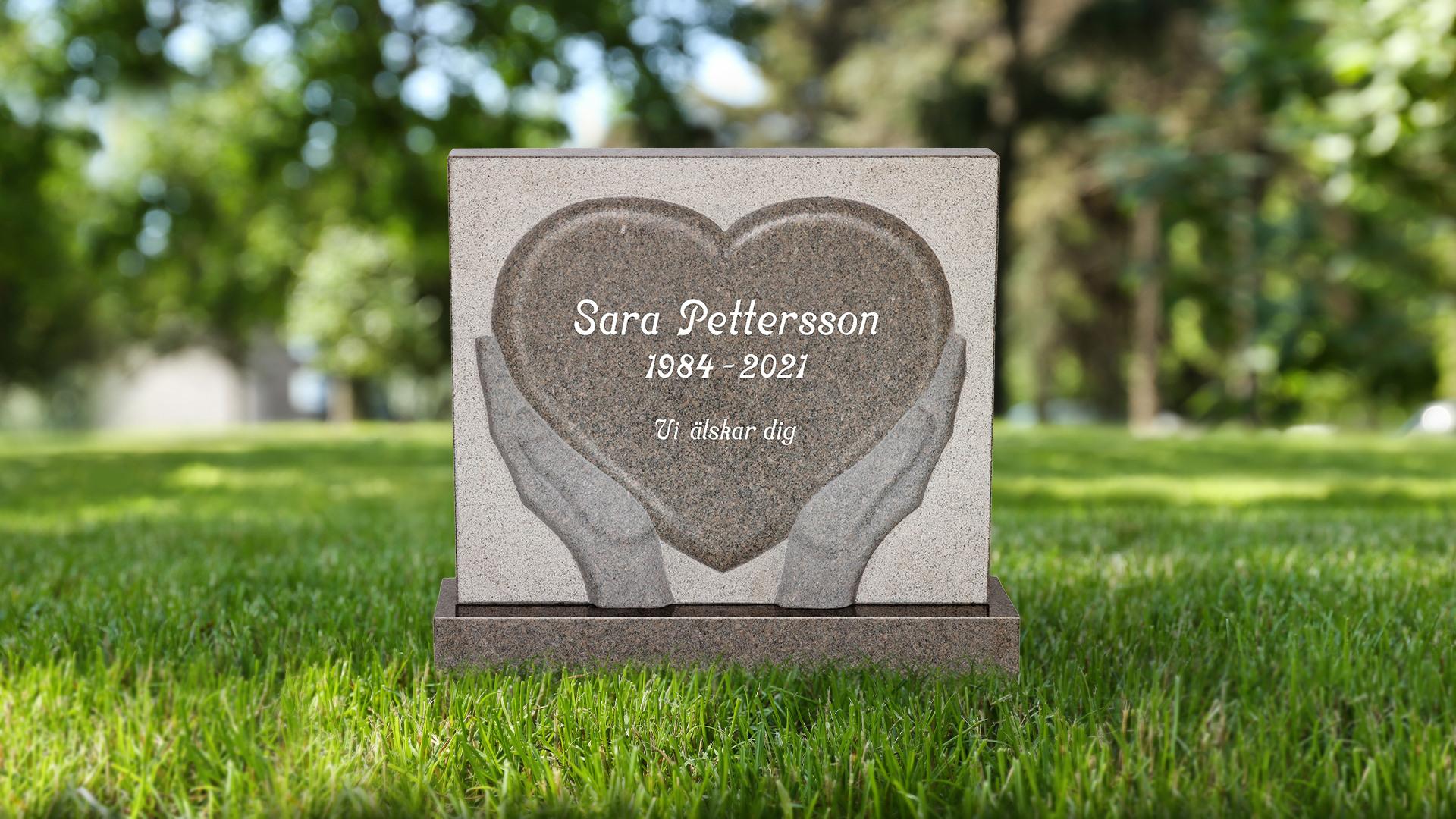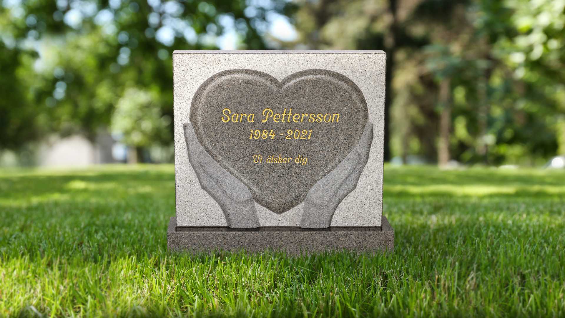 Stående sten med rektangulär yttre form och motivet av ett skulpterat hjärta i händer.- Modell: Stående bred