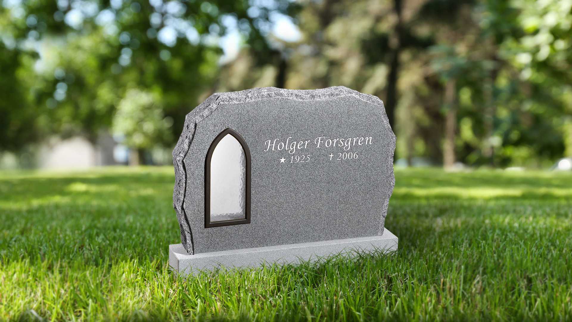 Stående sten med oregelbunden form och genomgående gotisk lykta- Modell: stående/bred