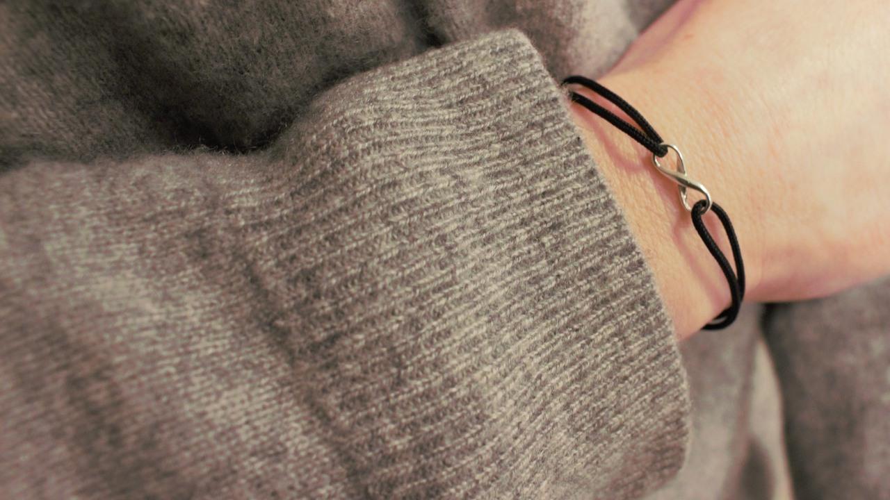- Armbandet är tillverkat av ett tunt svart band med en evighetssymbol i silver, designat av L8 Hasselblad.